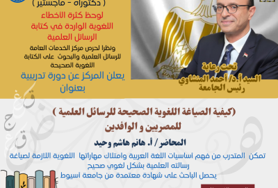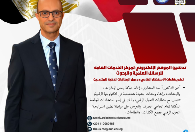 يسعدني أن أرحب بكل مستفيد من مركز الخدمات العامة للرسائل العلمية والبحوث بجامعة أسيوط ومرافقها وخدماتها، فأنتم بالتأكيد محور اهتمامنا ومحط أنظارنا وعنايتنا. كلما زاد قدر الرضا والسعادة لديكم كلما كبرت فرحتنا وسعادتنا . إن التقدم العلمي لأي دولة يقاس بما توليه من أهمية للبحث العلمي ، ولأن جامعة أسيوط تؤمن بأهمية البحث العلمي في بناء دولة ، تم إنشاء هذا المركز المتكامل لتقديم أفضل الخدمات للباحثين . ويعتبر وجود موقع إلكتروني للمركز يمثل التواجد باستمرار، بمعنى أن الموقع يفيد الباحثين بالجامعة،فوجود صفحة إلكترونية للمركز على موقع الجامعة تمكنهم من سرعة وسهولة التعرف على أنشطةالمركز وخدماته المختلفة التي تهدف الى تقديم الدعم الفني والتيسير على الباحثين حفاظا على وقتهم واموالهم للخروج برسالة علمية ذات جودة عالية . مع تمنياتي للجميع بالتوفيق . 44