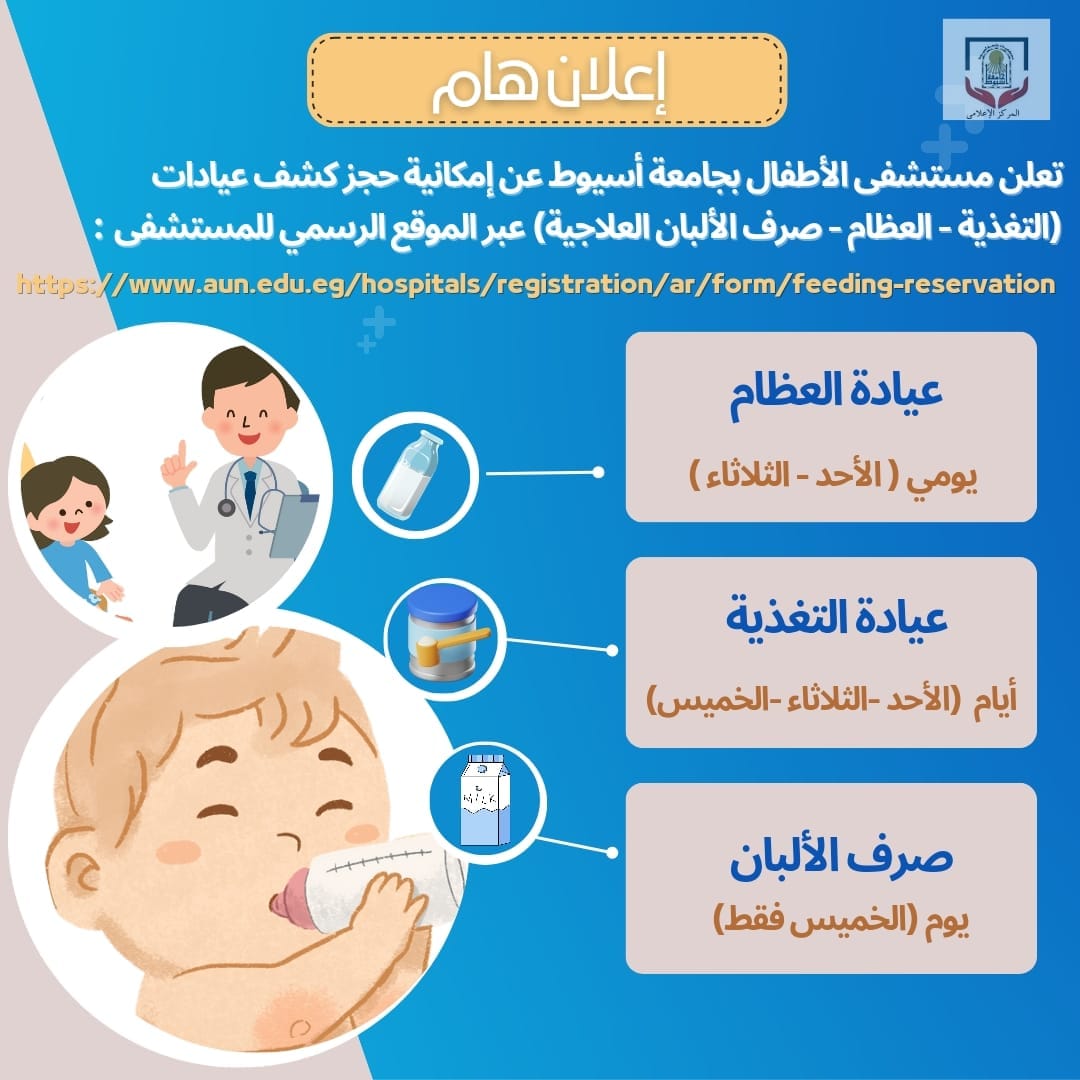 يذكر أن خدمة الكشف متاحة بعيادة العظام يومي الأحد والثلاثاء، وبعيادة التغذية في أيام الأحد والثلاثاء والخميس، ويتم صرف الألبان يوم الخميس من الساعة ٨ صباحا إلى ٢ ظهرا.