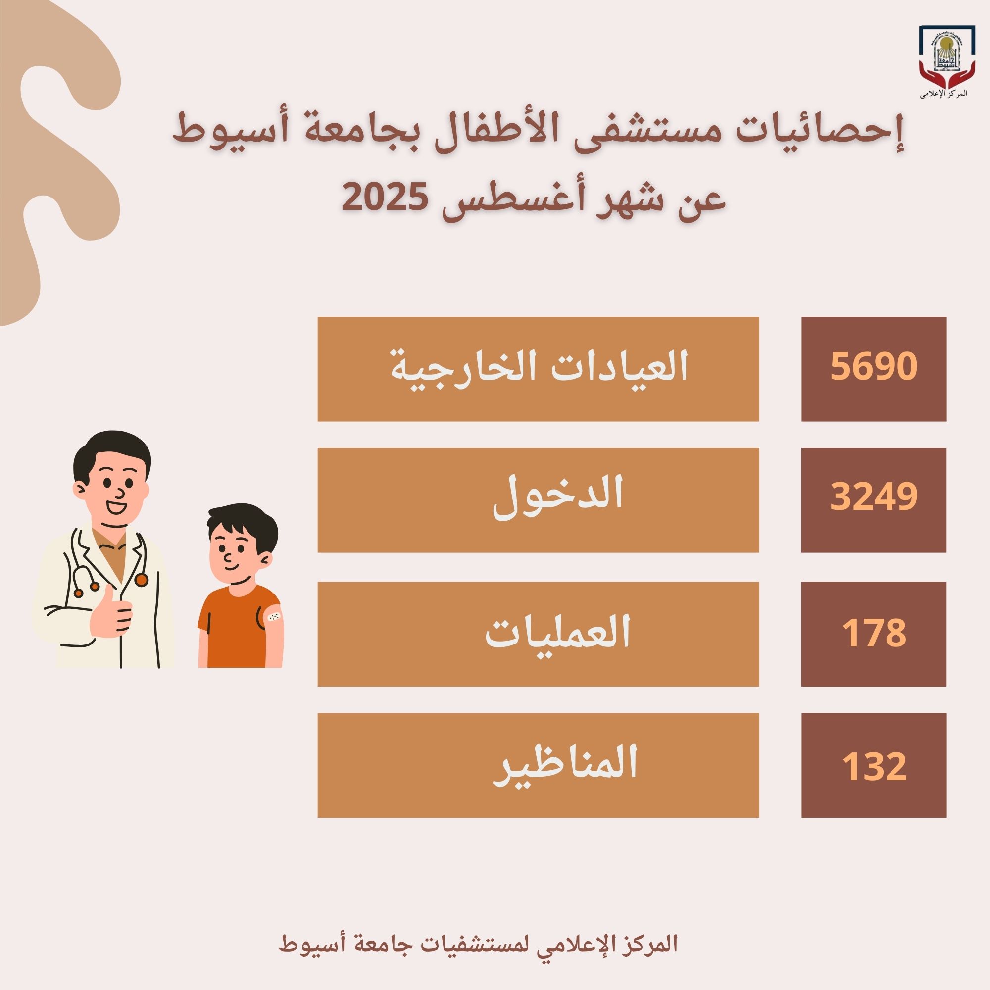 Assiut University Children's Hospital received (5690) visitors to its various clinics during the past month of August, under the patronage of Professor Dr. Ahmed Al-Minshawi, the University President, Professor Dr. Alaa Attia, Dean of the Faculty of Medicine and Chairman of the Board of University Hospitals, and Professor Dr. Yasser Farouk, Director of the Children's Hospital.
