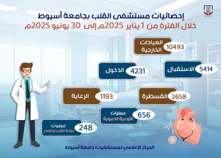 مستشفيات جامعة أسيوط تستعرض حصادها النصف سنوي ... وتعلن عن استقبال مستشفى القلب بجامعة أسيوط (10493) مترددا بمختلف عياداته خلال الفترة من 1 يناير 2025 إلى 30 يونيو 2025م