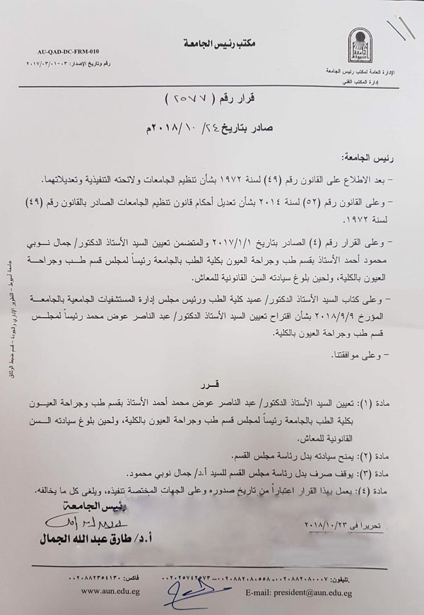 Appointing Prof. Abdel-Naser Awad Mohamed Ahmed, Head of the Ophthalmology Department 24 October 2018 Appointing Prof. Abdel-Naser Awad Mohamed Ahmed, Head of the Ophthalmology Department