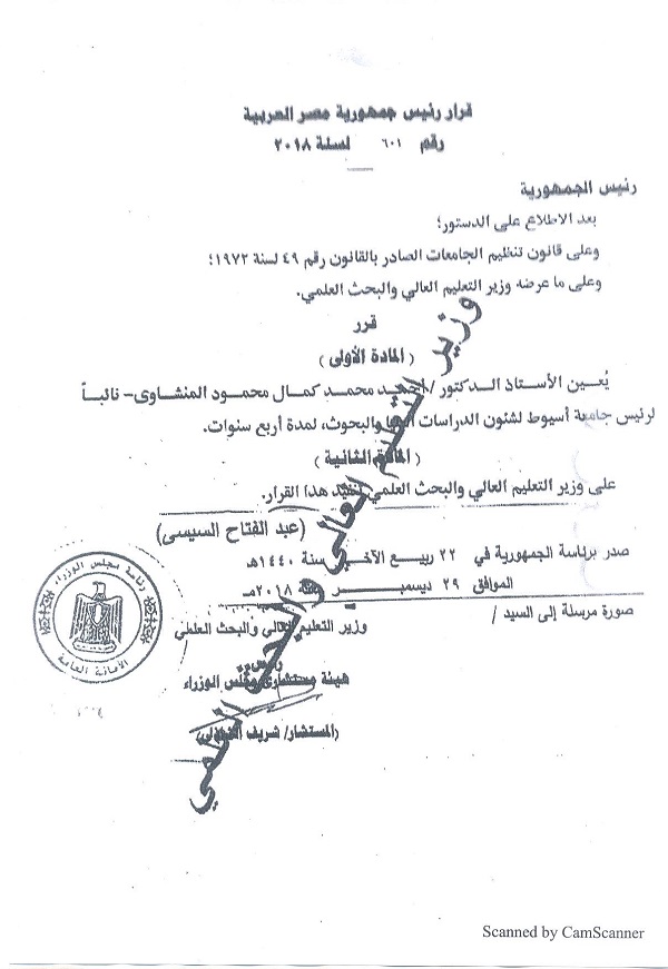 Appointing Prof. Ahmed Kamal El-Minshawy as the University Vice President of Post Graduate and Researches Affairs