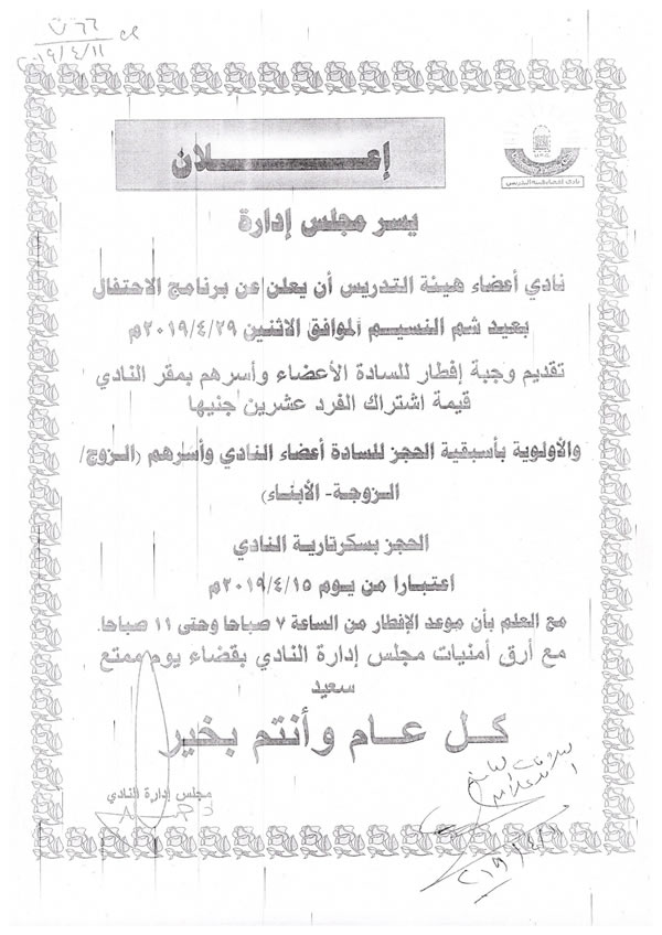 احتفال نادى أعضاء هيئة التدريس بيوم شم النسيم 29 أبريل 2019م