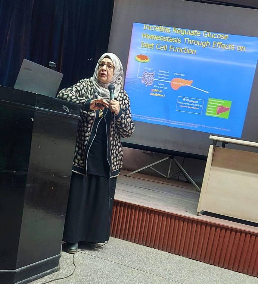 شهد اليوم العلمي حضوراً متميزاً من أطباء التدريب دفعة (٦١)، حيث حاضرت فيه الأستاذة الدكتورة لبنى التوني، أستاذ الأمراض الباطنة والغدد الصماء والسكر، والتي استعرضت بأسلوب تفاعلي أحدث البروتوكولات العلاجية لمرض السكري، وركزت المحاضرة على عدة محاور أساسية، منها، التعرف المبكر على مسببات داء السكري وأنواعه، وكيفية التعامل السريع والدقيق مع المضاعفات الحادة والمزمنة، إلى جانب الإشارة إلى أفضل الممارسات الإكلينيكية التي يجب أن يتقنها طبيب الامتياز أثناء فترة التدريب بالمستشفى.
