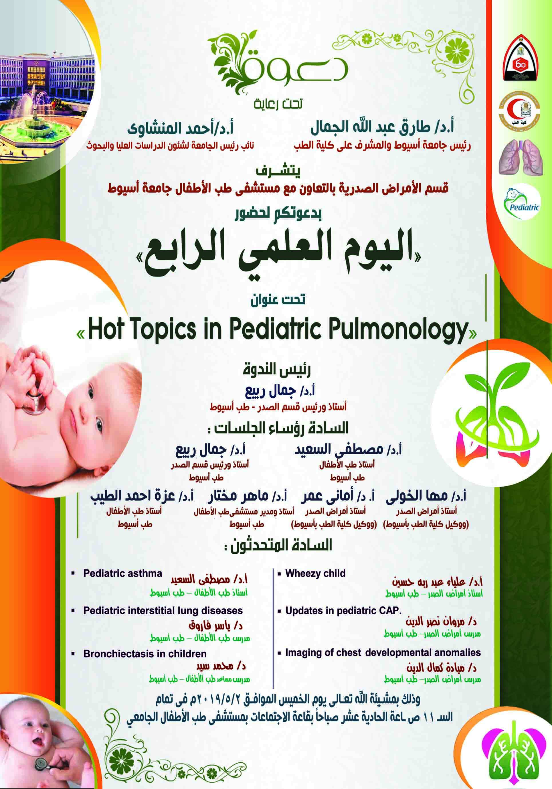 اليوم العلمى الرابع لقسم الأمراض الصدرية بالتعاون مع مستشفى طب الأطفال الجامعى 30 ابريل 2019 وذلك يوم الخميس الموافق 2019/5/2 م الساعة الحادية عشر ص بقاعة الاجتماعات بمستشفى الأطفال الجامعى
