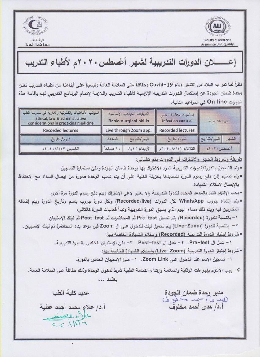 جداول الدورات التدريبية لشهر أغسطس التي تقيمها وحدة ضمان الجودة بكلية الطب 9 أغسطس 2020 1- أطباء التدريب - 2- طلاب الدراسات العليا ( ماجستير )