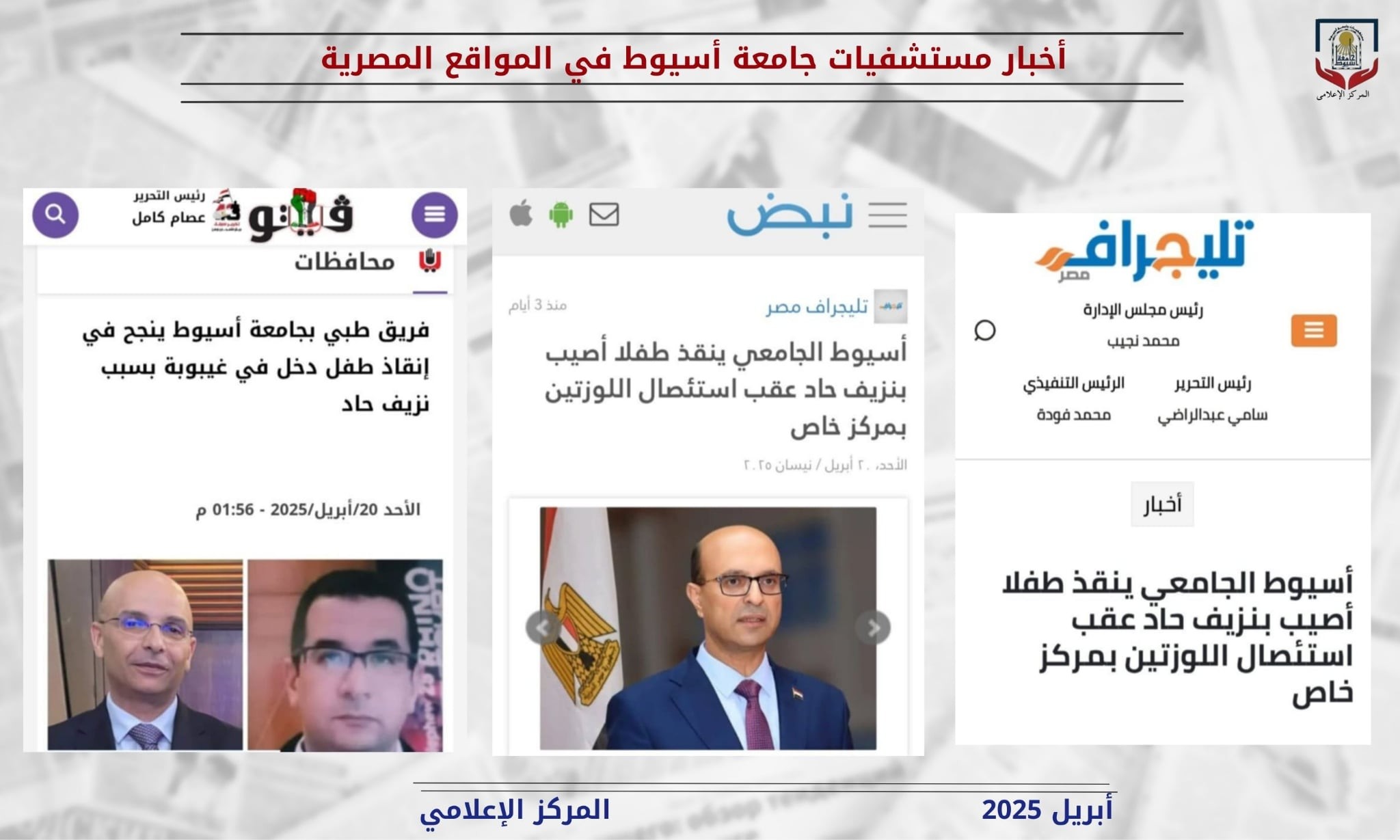 خلال شهر أبريل الجاري، نجح فريق طبي بقسم جراحة الأنف والأذن والحنجرة بالمستشفى الرئيسي بجامعة أسيوط في إنقاذ حياة طفل أصيب بنزيف حاد عقب استئصال اللوزتين