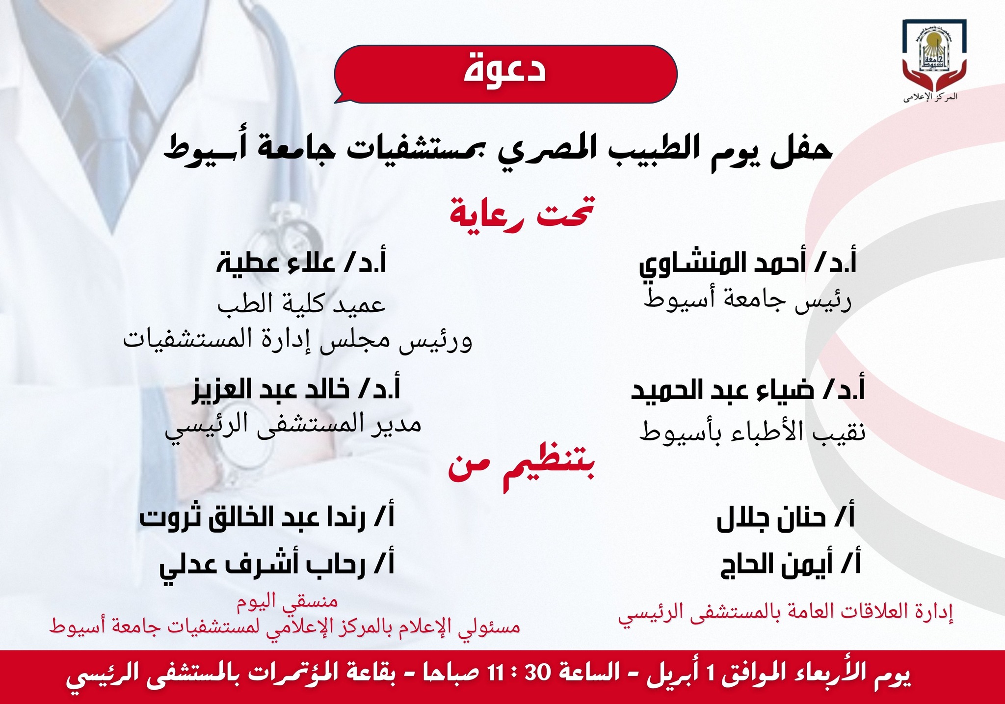 أعلن المركز الإعلامي بمستشفيات جامعة أسيوط عن تنظيم احتفالية كبرى لإحياء ذكرى "يوم الطبيب المصري"، وذلك يوم الأربعاء الموافق الأول من أبريل المقبل، وذلك تحت رعاية الأستاذ الدكتور أحمد المنشاوي، رئيس الجامعة، والأستاذ الدكتور علاء عطية عميد كلية الطب ورئيس مجلس إدارة المستشفيات الجامعية، والأستاذ الدكتور ضياء عبد الحميد، نقيب الأطباء بأسيوط، والأستاذ الدكتور خالد عبد العزيز، مدير المستشفى الجامعي الرئيسي، وبتنظيم من الأستاذة رندا عبد الخالق ثروت، والأستاذة رحاب أشرف، مسؤلي الإعلام بالمركز الإعلامي للمستشفيات ومنسقي اليوم، بالتعاون مع الأستاذة حنان جلال، والأستاذ أيمن الحاج، بإدارة العلاقات العامة بالمستشفى الجامعي الرئيسي.