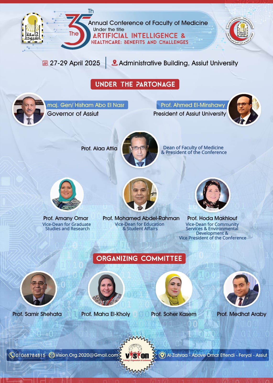 تنظم كلية الطب بجامعة أسيوط يوم طلابي حول أبرز الأنشطة والإسهامات البحثية لطلاب كلية الطب وأطباء التدريب، وذلك على هامش أعمال مؤتمرها السنوى الخامس والثلاثون، تحت رعاية الأستاذ الدكتور أحمد المنشاوي رئيس الجامعة، والأستاذ الدكتور علاء عطية عميد كلية الطب ورئيس مجلس إدارة المستشفيات الجامعية ورئيس المؤتمر، والأستاذة الدكتورة أماني عمر وكيل الكلية لشئون الدراسات العليا والبحوث، والأستاذ الدكتور محمد عبد الرحمن وكيل الكلية لشئون التعليم والطلاب، والأستاذة الدكتورة هدى مخلوف وكيل الكلية لشئون خدمة المجتمع وتنمية البيئة، وبتنظيم من الأستاذ الدكتور سمير شحاته، والأستاذة الدكتورة مها الخولي، والأستاذة الدكتورة سهير قاسم، والأستاذ الدكتور مدحت العربي.