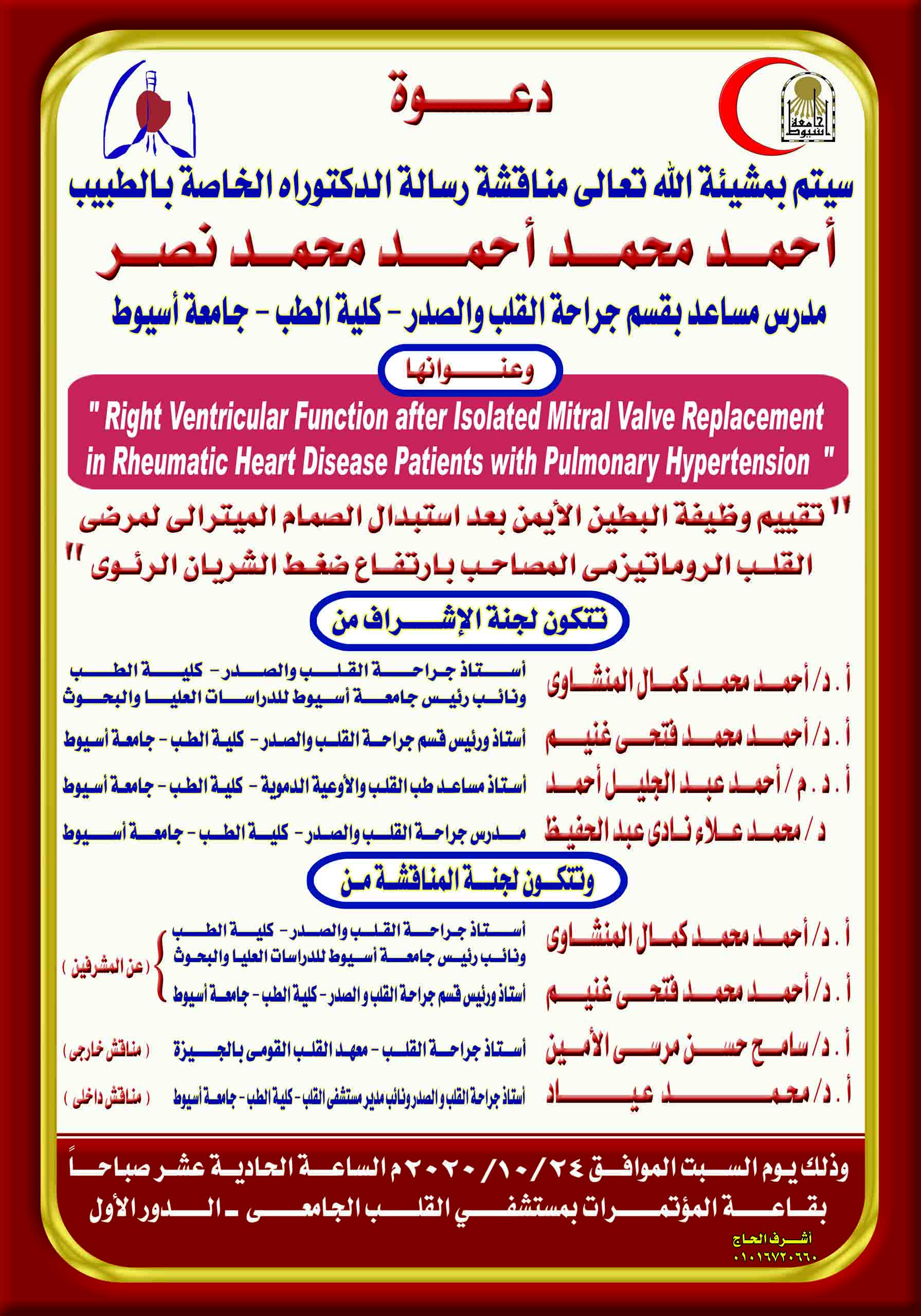 مناقشة رسالة الدكتوراه الخاصة بالطبيب / أحمد محمد أحمد محمد نصر - مدرس مساعد بقسم جراحة القلب والصدر - كلية الطب - جامعة أسيوط
