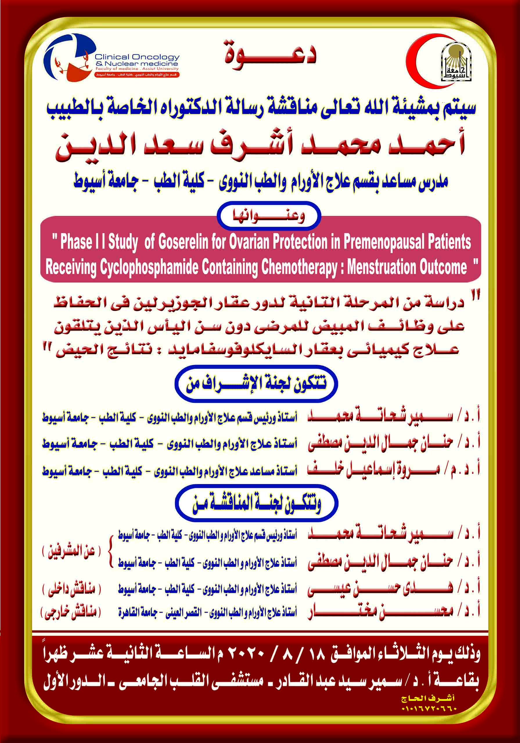 مناقشة رسالة الدكتوراه الخاصة بالطبيب / أحمد محمد أشرف سعد الدين - مدرس مساعد بقسم علاج الأورام والطب النوووى - كلية الطب - جامعة أسيوط
