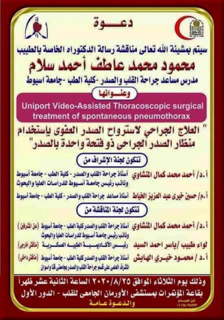مناقشة رسالة الدكتوراه الخاصة بالطبيب/ محمود محمد عاطف أحمد سلام - المدرس المساعد بقسم جراحة القلب والصدر