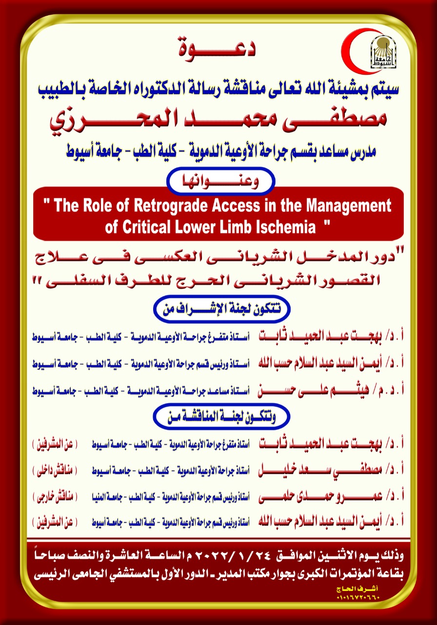 مناقشة رسالة الدكتوراه الخاصة بالطبيب / مصطفى محمد المحرزى - مدرس مساعد بقسم جراحة الأوعية الدموية والشرايين - كلية الطب - جامعة أسيوط