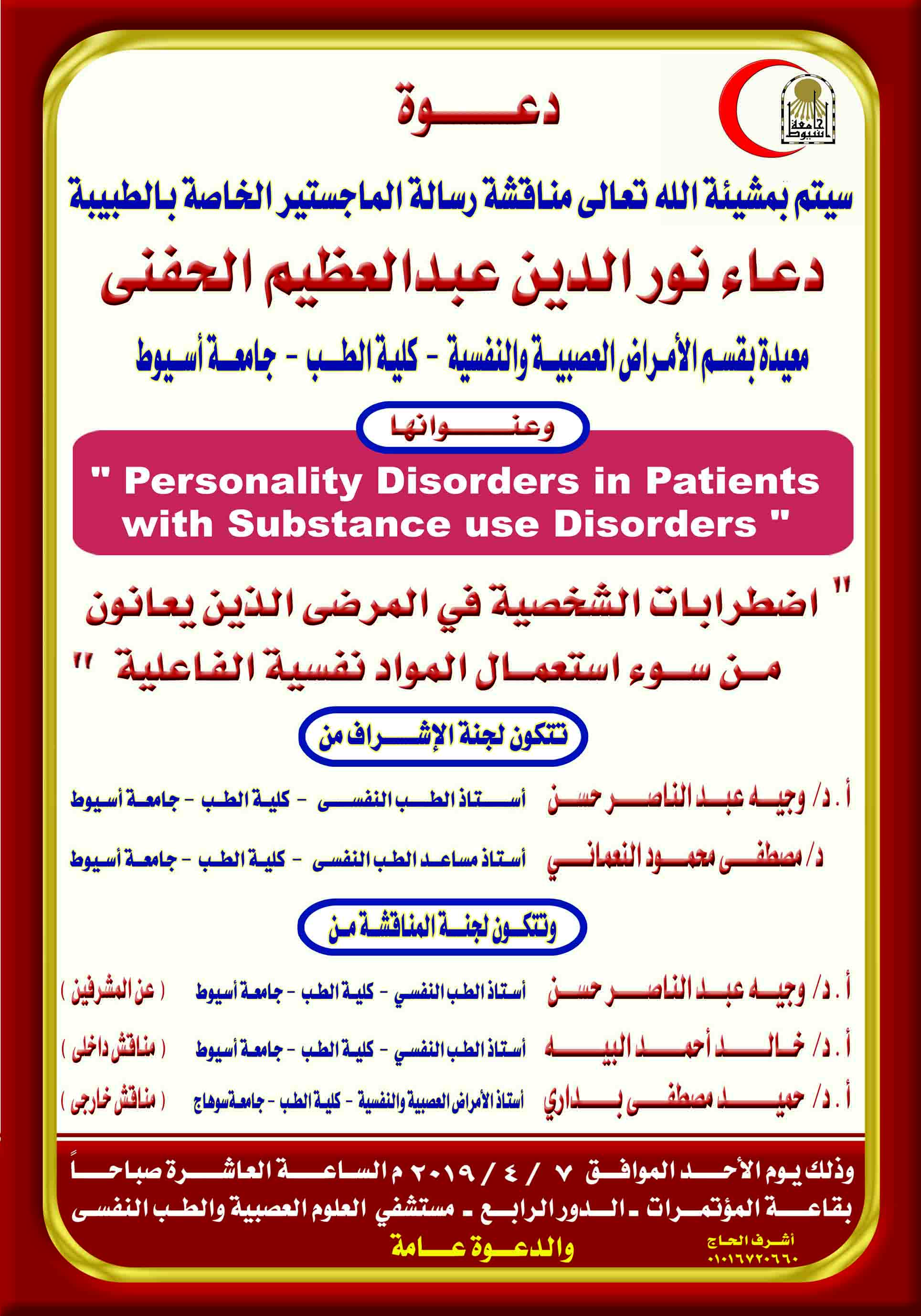 مناقشة رسالة الماجستير 4 ابريل 2019 سوف تتم مناقشة رسالة الماجستير في الأمراض النفسية والعصبية الخاصة الخاصة بالطبيبة / دعاء نورالدين عبدالعظيم الحفنى معيدة بقسم الأمراض النفسية والعصبية – كلية الطب – جامعة أسيوط