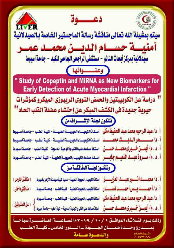 مناقشة رسالة الماجستير الخاصة بالصيدلانية / أمنية حسام الدين محمد عمر - صيدلانية بمركز أبحاث النانو - بمستشفى الراجحى الجامعى للكبد- جامعة أسيوط
