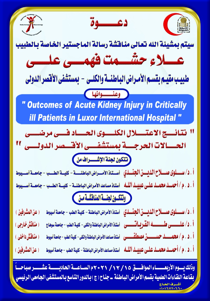 مناقشة رسالة الماجستير الخاصة بالطبيب / علاء حشمت فهمى على - طبيب مقيم بقسم الأمراض الباطنة والكلى - بمستشفى الأقصر الدولى