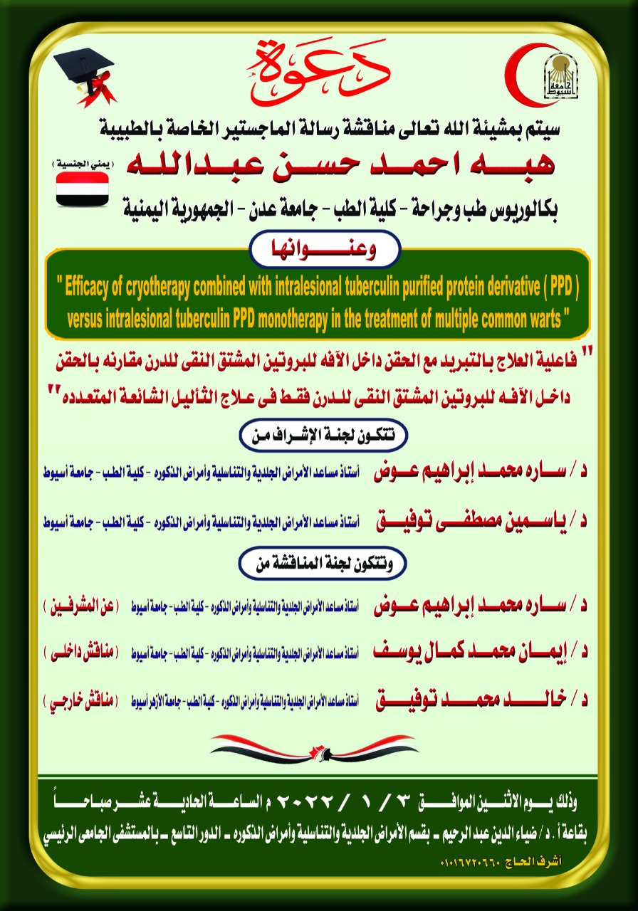 مناقشة رسالة الماجستير الخاصة بالطبيبة / هبه أحمد حسن عبد الله - قسم الجلدية جامعة عدن اليمن 29 ديسمبر 2021 يوم الأحد الموافق 2022/1/3 م الساعة 11 ص بالقسم