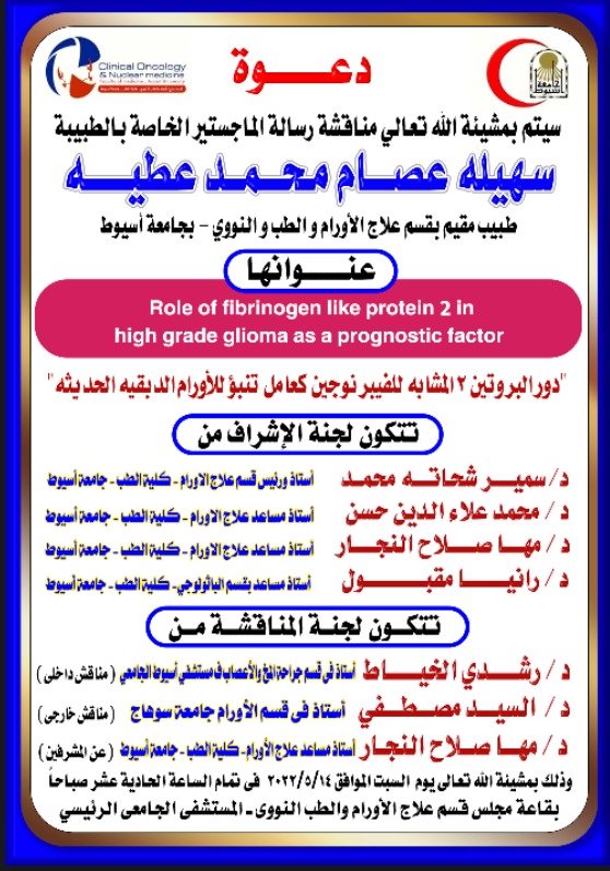 مناقشة رسالة الماجستير الخاصة بالطبيبة / سهيله عصام محمد عطية - طبيب مقيم بقسم علاج الأورام والطب النووى - كلية الطب - جامعة أسيوط