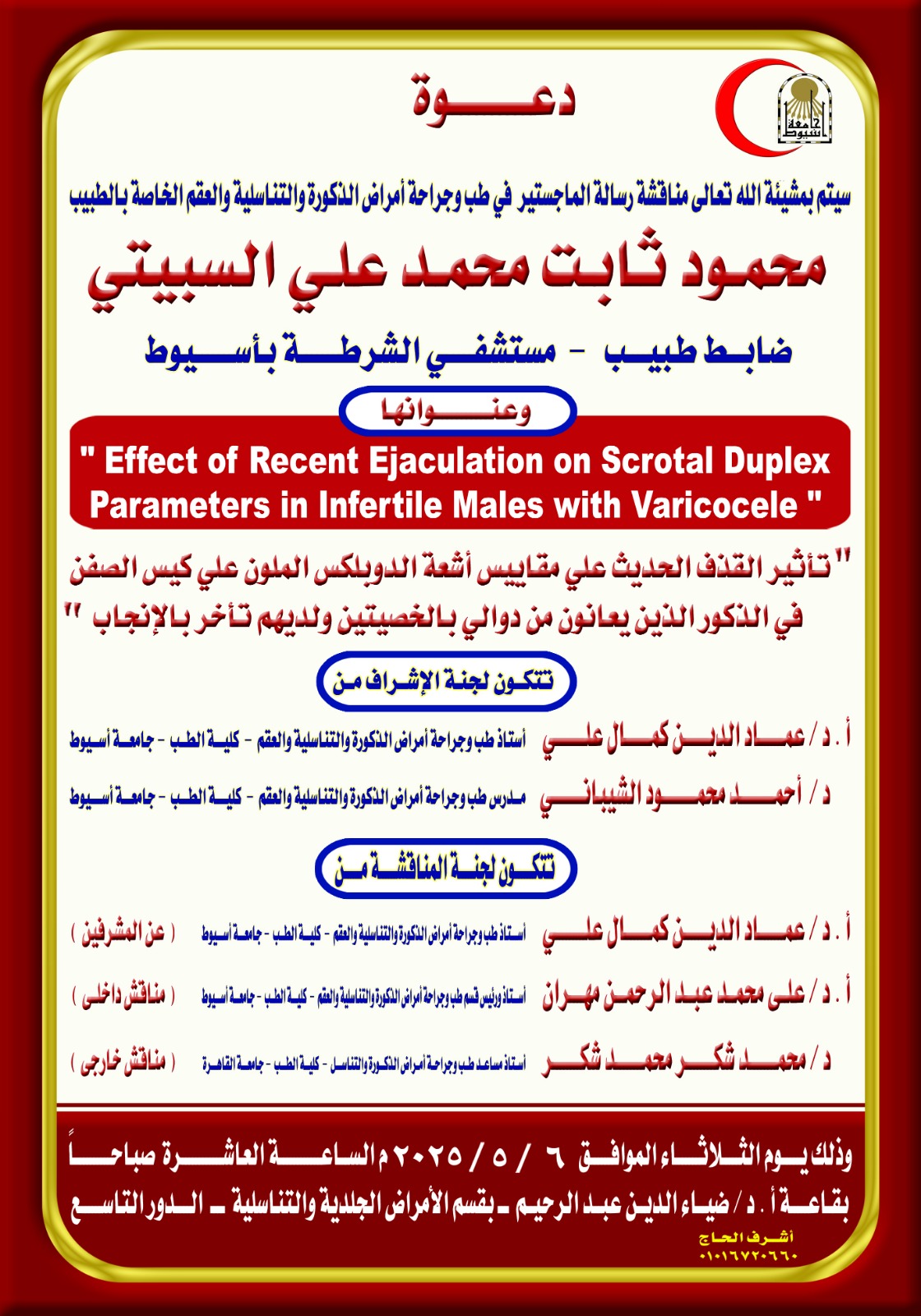مناقشة رسالة الماجستير في طب وجراحة أمراض الذكوره والتناسلية والعقم الخاصة بالطبيب / محمود ثابت محمد على السبيتي - طبيب أمراض جلدية بمستشفي الشرطة بأسيوط