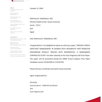 فاز البحث المقدم من أ . د / محمود عبدالعليم - بجائزة أفضل بحث في المؤتمر السنوي للجمعيه الامريكيه لطب التكاثر ASRM- ُEarly Preganncy SIG 2020 , و المنعقد حاليا.