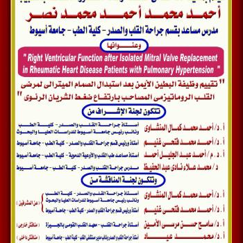 مناقشة رسالة الدكتوراه الخاصة بالطبيب / أحمد محمد أحمد محمد نصر - مدرس مساعد بقسم جراحة القلب والصدر - كلية الطب - جامعة أسيوط