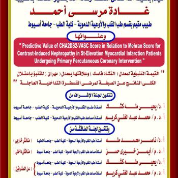مناقشة رسالة الماجستيرالخاصة بالطبيبة / غادة مرسى محمد - طبيب مقيم بقسم طب القلب والأوعية الدموية - كلية الطب - جامعة أسيوط