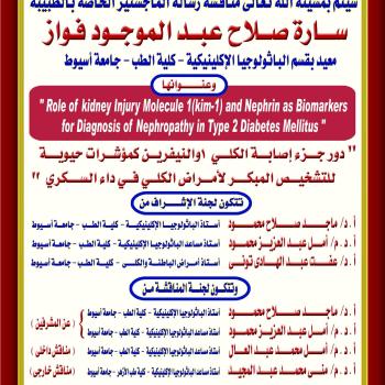 مناقشة رسالة الماجستير الخاصة بالطبيبة / سارة صلاح عبد الموجود فواز - معيدبقسم الباثولوجيا الإكلينيكية - كلية الطب - جامعة أسيوط