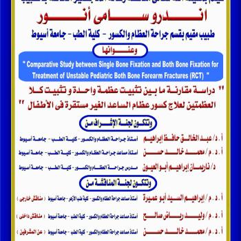 مناقشة رسالة الماجستيرالخاصة بالطبيب / اندروا سامى أنور - طبيب مقيم بقسم جراحة العظام - كلية الطب - جامعة أسيوط