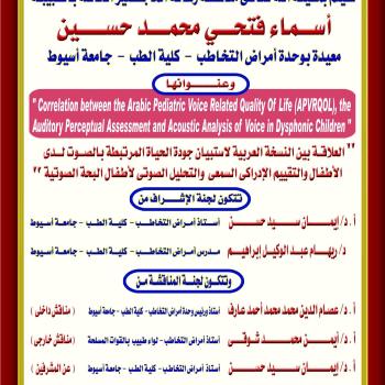 مناقشة رسالة الماجستير الخاصة بالطبيبة / أسماء فتحى محمد حسين - معيدة بوحدة أمراض التخاطب - كلية الطب - جامعة أسيوط