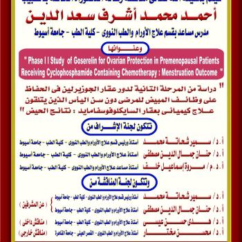 مناقشة رسالة الدكتوراه الخاصة بالطبيب / أحمد محمد أشرف سعد الدين - مدرس مساعد بقسم علاج الأورام والطب النوووى - كلية الطب - جامعة أسيوط