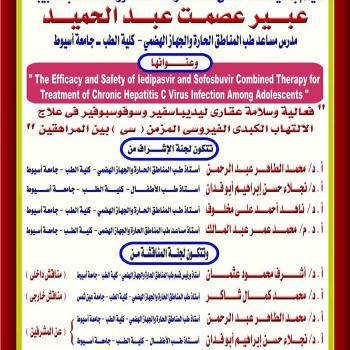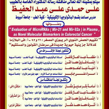 مناقشة رسالة الدكتوراه الخاصة بالطبيب / على حمدى على عبد الحفيظ مدرس مساعد الباثولوجيا الإكلينيكية - كلية الطب - جامعة أسيوط