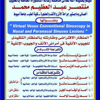 مناقشة رسالة الدكتوراه الخاصة بالطبيب / منتصر عبد العظيم محمد - أخصائى وماجستير جراحة الأذن والأنف والحنجرة - كلية الطب - جامعة أسيوط