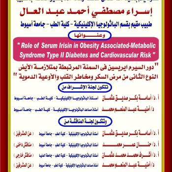 مناقشة رسالة الماجستيرالخاصة بالطبيبة / إسراء مصطفي أحمد عبد العال طبيب مقيم مساعد الباثولوجيا الإكلينيكية - كلية الطب - جامعة أسيوط