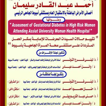 مناقشة رسالة الدكتوراه الخاصة بالطبيب / أحمد عبد القادر سليمان أخصائى الأمراض الباطنة بالاستقبال العام - بالمستشفى الجامعى الرئيسي