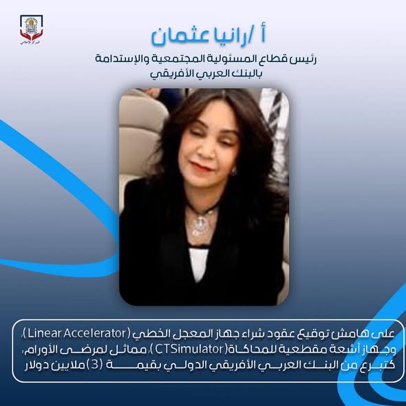 أبرز تصريحات، الأستاذة رانيا عثمان رئيس قطاع المسئولية المجتمعية والاستدامة بالبنك العربي الأفريقي الدولي، خلال مراسم توقيع عقود شراء جهاز المعجل الخطي (Linear Accelerator) الأحدث عالمياً، وجهاز الأشعة المقطعية للمحاكاة (CT Simulator)، كتبرع من البنك العربي الأفريقي الدولي لقسم علاج الأورام والطب النووي بمستشفيات جامعة أسيوط، وذلك في إطار بروتوكول التعاون بينهم بتكلفة (٣) ملايين دولار