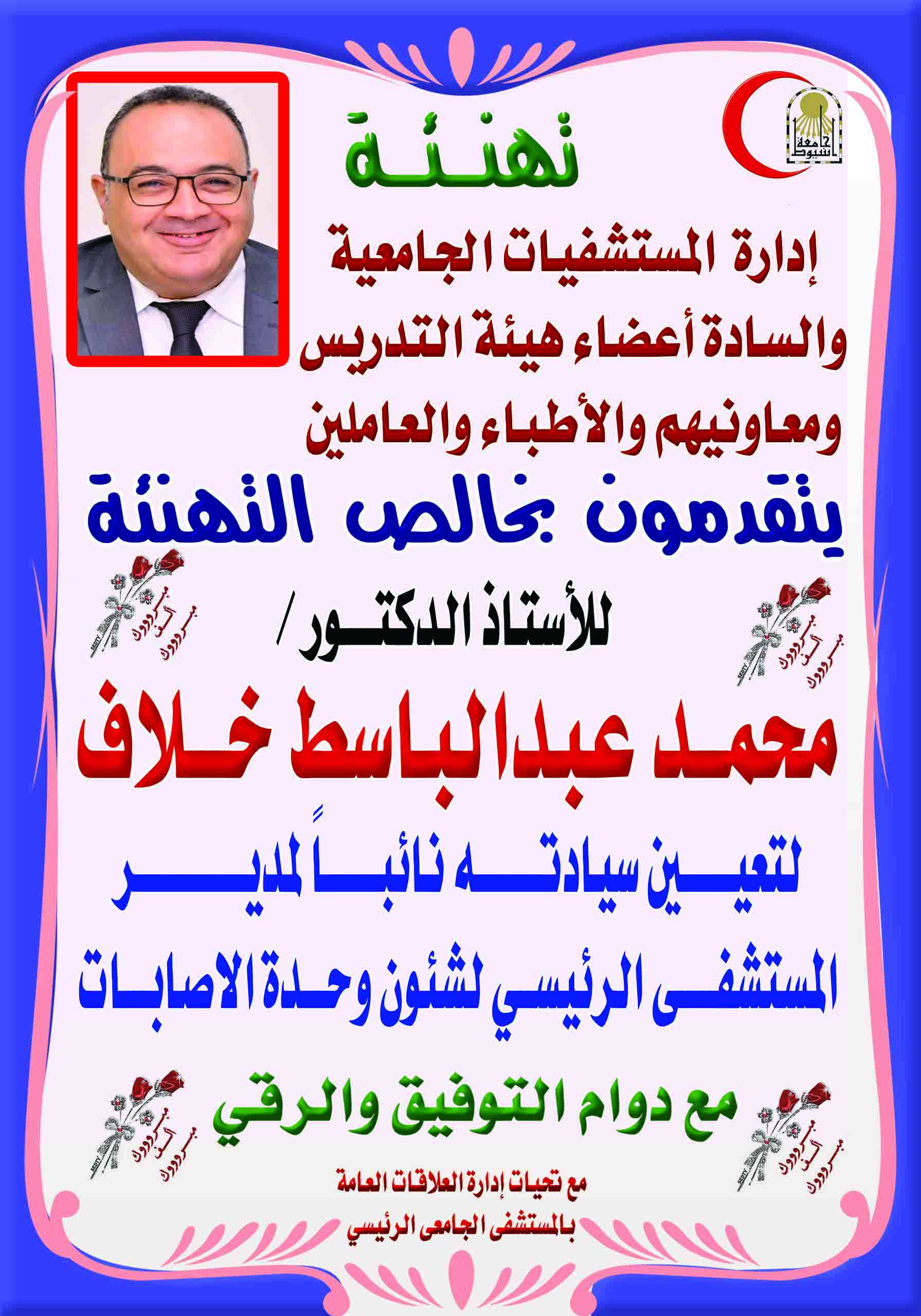 تهنئـــــــــة 2 يونيو 2020 تهنئ إدارة المستشفيات الجامعية والسادة أعضاء هيئة التدريس ومعاونيهم والأطباء والعاملين السيد الأستاذ الدكتور/ محمد عبد الباسط خلاف لتعيين سيادته نائباً لمدير المستشفى الجامعى الرئيسي لشئون وحدة الاصابات متمنيين لسيادته خالص التوفيق والسداد