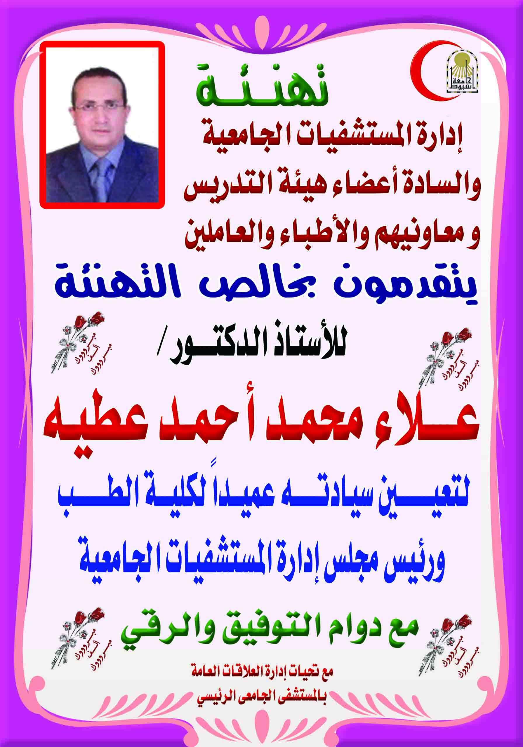 تهنئـــــــــة 1 يونيو 2020 تهنئ إدارة المستشفيات الجامعية والسادة أعضاء هيئة التدريس ومعاونيهم والأطباء والعاملين السيد الأستاذ الدكتور/ علاء محمد أحمد عطية لتعيين سيادته عميداً لكلية الطب ورئيس مجلس إدارة المستشفيات الجامعية متمنيين لسيادته خالص التوفيق والسداد