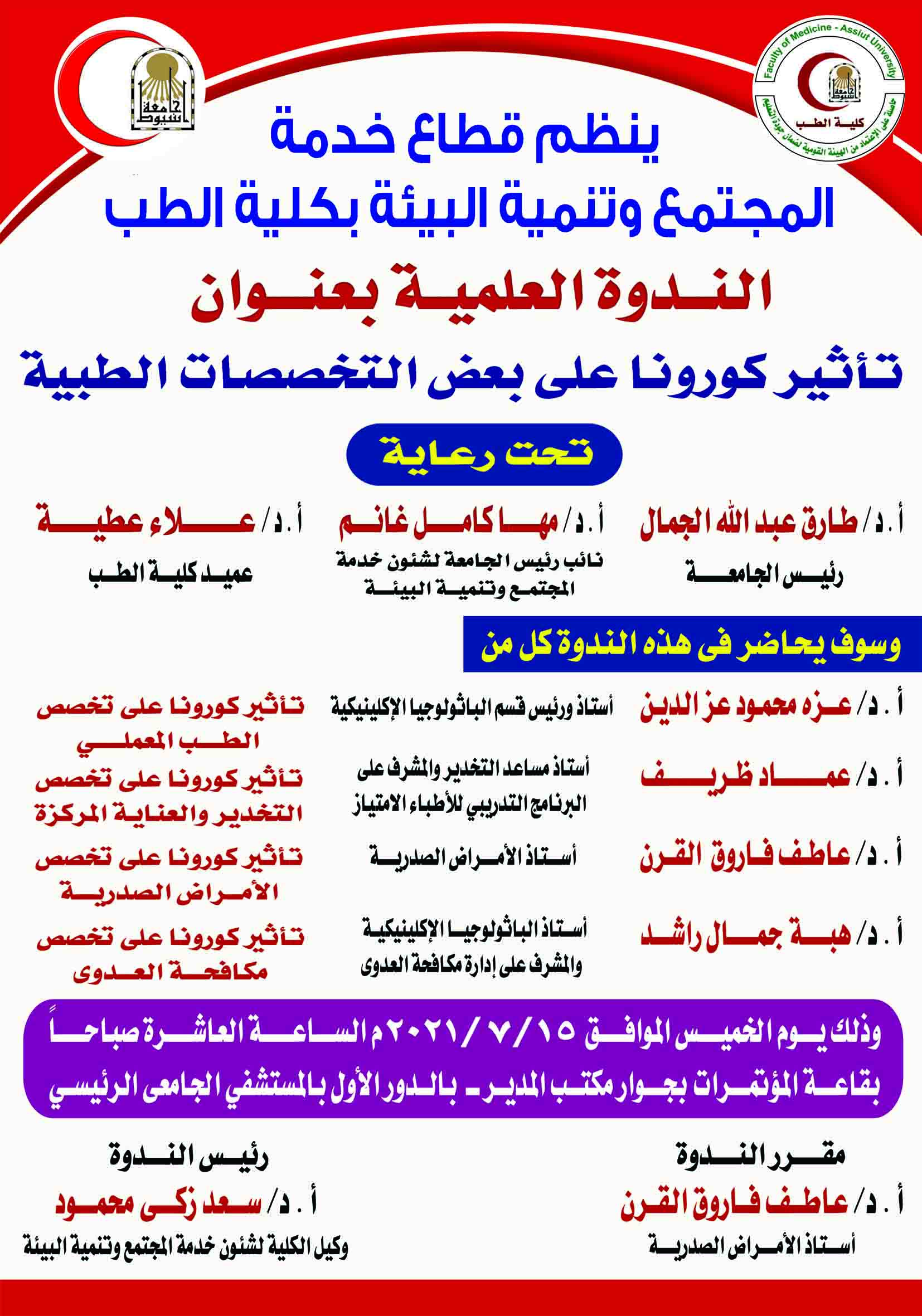 ينظم قطاع خدمة المجتمع وتنمية البيئة بكلية الطب الندوة العلمية بعنوان " تأثير كورونا على بعض التخصصات الطبية "