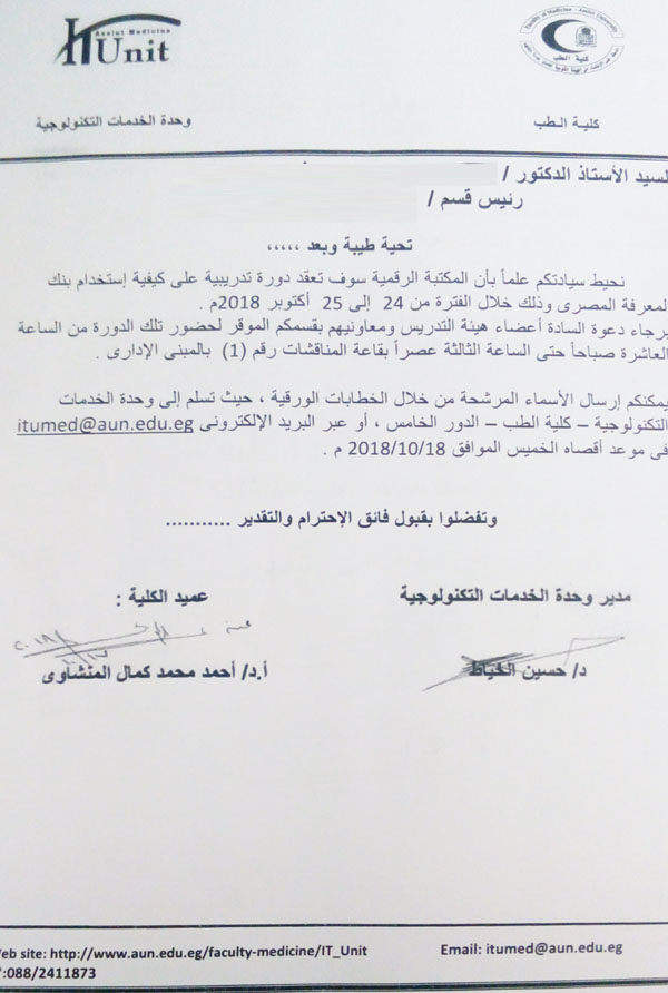 Announcement of "How to use Knowledge Bank" Course 22 October 2018 A course about How to use Egyptian Knowledge Bank will be held on 24-25 Oct. 2018 at 10 AM in Meeting Hall in Administration Bulding