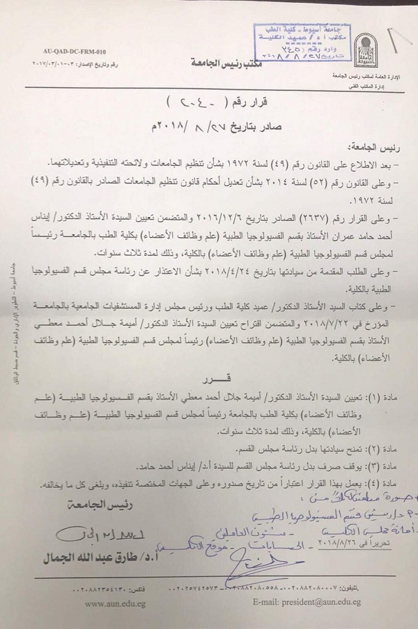 Appointment of Prof. Omyma Galal Ahmed Moaty as Chairman of Physiology Department 27 August 2018 Appointment of Prof. Omyma Galal Ahmed Moaty as Chairman of Physiology Department