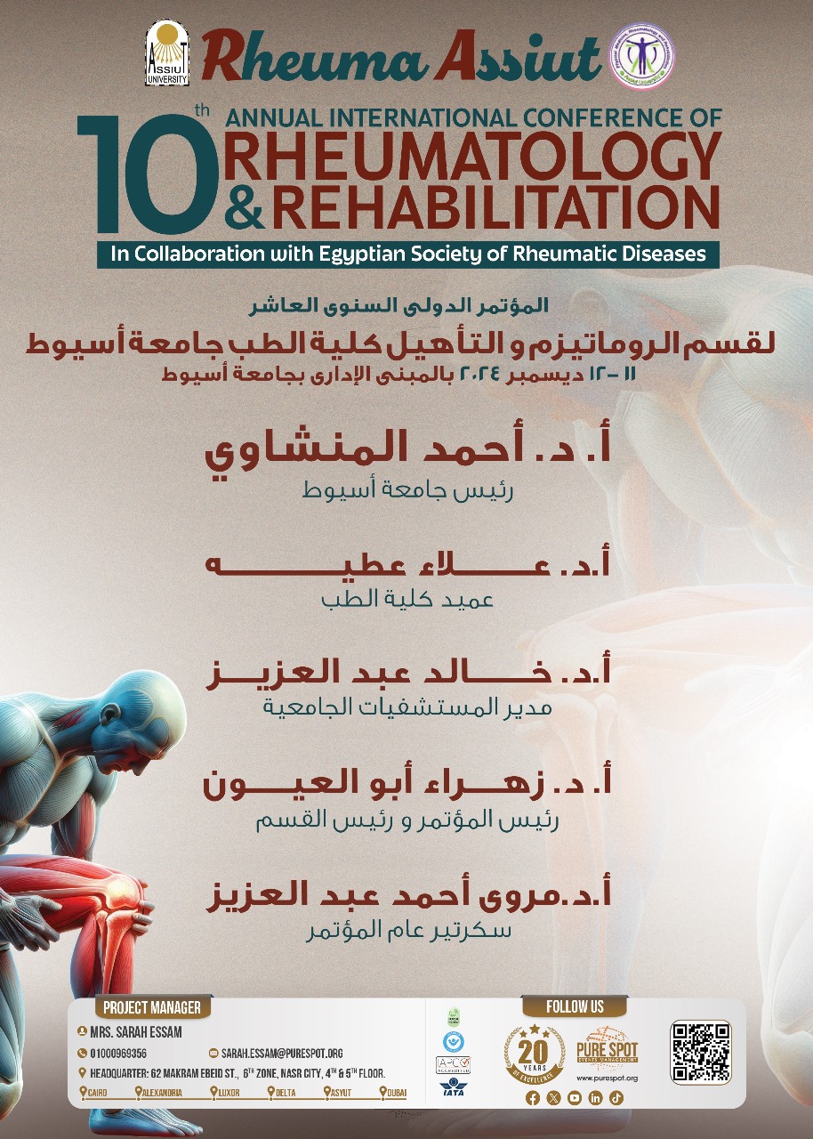 ينظم قسم الروماتيزم والتأهيل والطب الطبيعي بكلية الطب جامعة أسيوط مؤتمره السنوي الدولي العاشر يومي ١١-١٢ من ديسمبر ، وذلك بالتعاون مع الجمعية المصرية للأمراض الروماتيزمية، تحت رعاية الأستاذ الدكتور أحمد المنشاوي رئيس الجامعة، والأستاذ الدكتور جمال عبد الرؤوف بدر نائب رئيس الجامعة لشئون الدراسات العليا والبحوث، والأستاذ الدكتور أحمد محمد عبد المولى نائب رئيس الجامعة لشئون التعليم والطلاب، والأستاذ الدكتور محمود أحمد عبد العليم نائب رئيس الجامعة لشئون خدمة المجتمع وتنمية البيئة، والأستاذ الدكتور علاء عطية عميد كلية الطب ورئيس مجلس إدارة المستشفيات الجامعية، والأستاذة الدكتورة أماني عمر وكيل كلية الطب لشئون الدراسات العليا والبحوث، والأستاذ الدكتور محمد عبد الرحمن وكيل كلية الطب لشئون التعليم والطلاب، والأستاذة الدكتورة هدى مخلوف وكيل كلية الطب لشئون خدمة المجتمع وتنمية البيئة، والأستاذ الدكتور خالد عبد العزيز مدير المستشفى الجامعي الرئيسي، وتحت إشراف الأستاذة الدكتورة زهراء أبو العيون رئيس قسم الروماتيزم والتأهيل، ورئيس المؤتمر، والأستاذة الدكتورة مروى أحمد عبد العزيز أستاذ مساعد الروماتيزم والتأهيل وسكرتير عام المؤتمر.