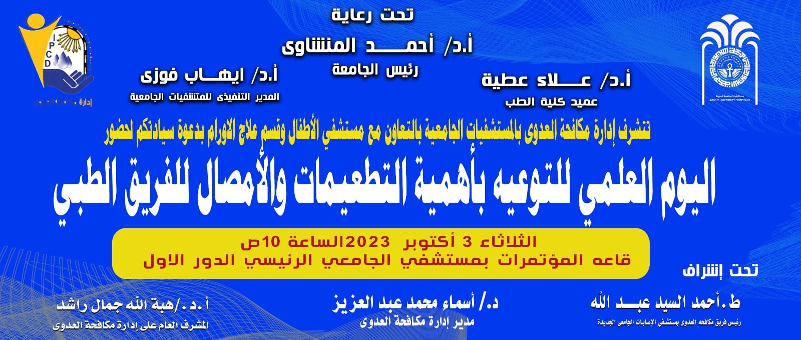 يأتي اليوم العلمي تحت إشراف الدكتور علاء عبد المنعم مدير المستشفى الرئيسي، والدكتور محمد أمير فتحي مدير مستشفى الأطفال، والدكتور سمير شحاته رئيس قسم الأورام، والدكتورة هبة الله جمال راشد المشرف العام على إدارة مكافحة العدوى، والدكتورة أسماء محمد عبد العزيز مدير إدارة مكافحة العدوى، والدكتور أحمد السيد عبد الله رئيس مكافحة العدوى بمستشفى الإصابات الجديدة، وذلك يوم ٣ أكتوبر الساعة ١٠ صباحا بقاعة المؤتمرات بالمستشفى الجامعي الرئيسي.