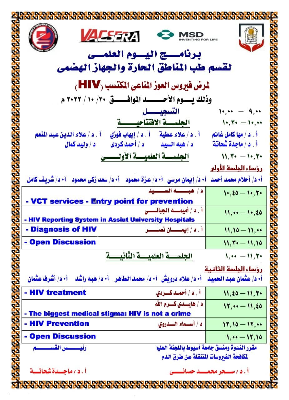 ٣٠ أكتوبر .. " طب المناطق الحارة والجهاز الهضمي بمستشفيات جامعة أسيوط " ينظم يوم علمي عن مرض فيروس العوز المناعي المكتسب بحضور مدير البرنامج الوطني لمكافحة الإيدز