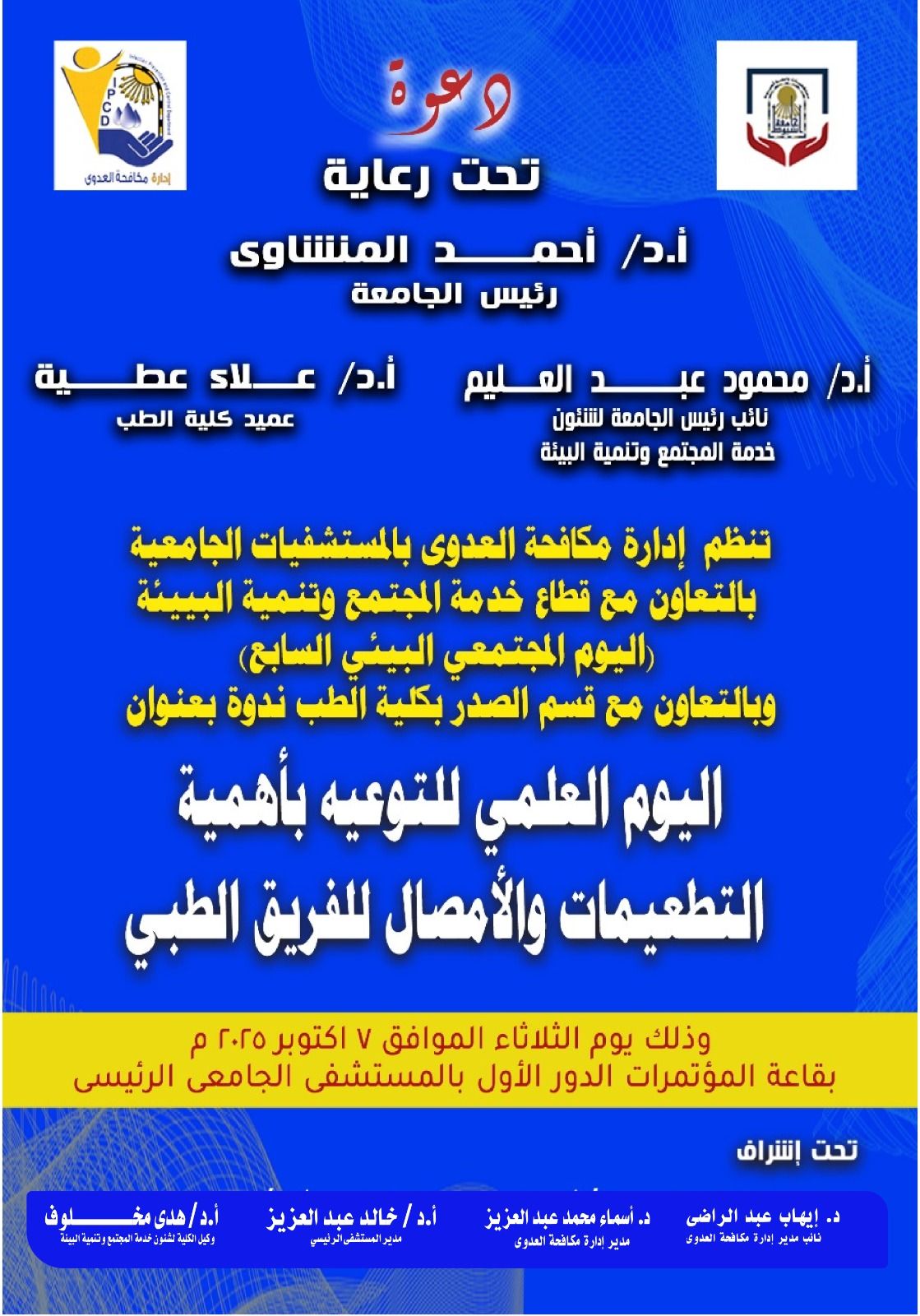 تعقد إدارة مكافحة العدوى بمستشفيات جامعة أسيوط ندوة علمية، بعنوان "اليوم العلمي للتوعية بأهمية التطعيمات والأمصال للفريق الطبي"، يوم الثلاثاء الموافق ٧ أكتوبر، وذلك بالتعاون مع قطاع خدمة المجتمع وتنمية البيئة، وقسم الصدر بكلية الطب جامعة أسيوط، يأتي هذا تحت رعاية الأستاذ الدكتور أحمد المنشاوي رئيس الجامعة، والأستاذ الدكتور محمود عبد العليم، نائب رئيس الجامعة لشئون خدمة المجتمع وتنمية البيئة، والأستاذ الدكتور علاء عطيه، عميد كلية الطب ورئيس مجلس إدارة المستشفيات الجامعية، وبإشراف الأستاذة الدكتورة هدى مخلوف، وكيل الكلية لشئون خدمة المجتمع وتنمية البيئة، والأستاذ الدكتور خالد عبد العزيز، مدير المستشفى الرئيسي، والدكتورة أسماء محمد عبد العزيز، مدير إدارة مكافحة العدوى، والدكتور إيهاب عبد الراضي، نائب مدير إدارة مكافحة العدوى.