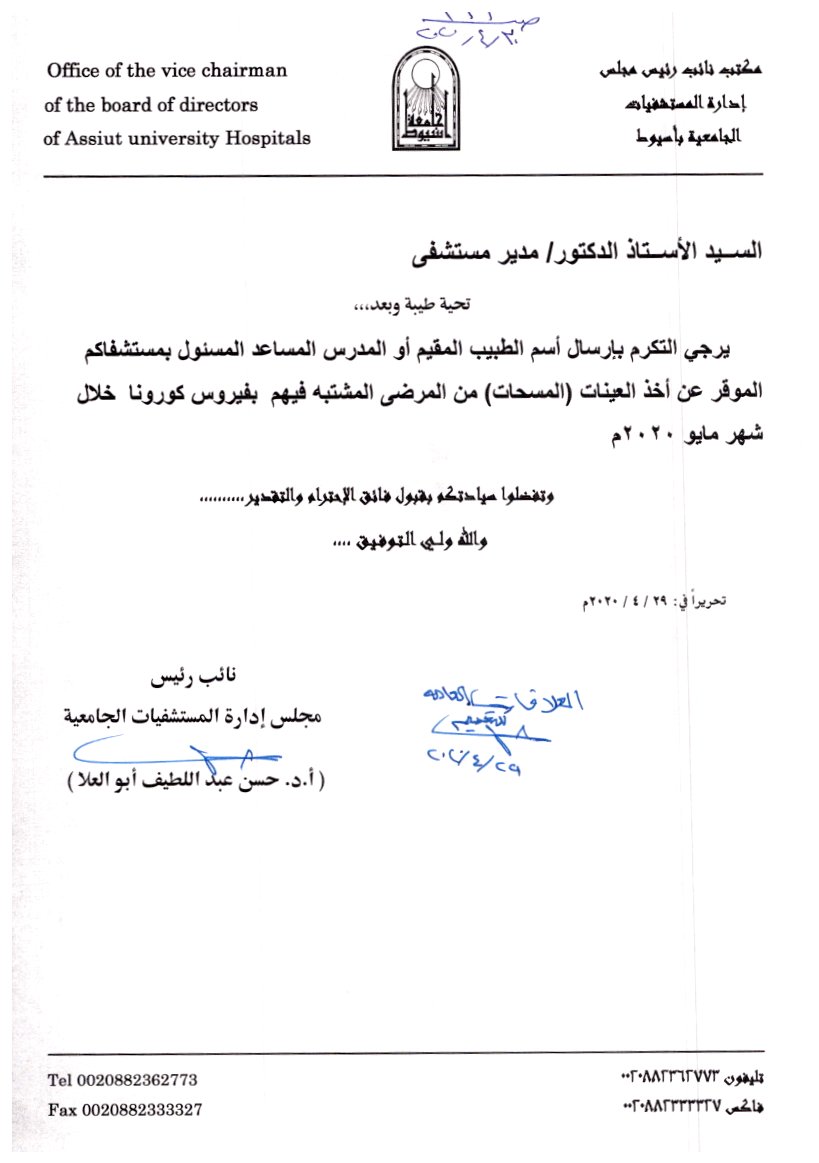 اعلان هام للمستشفيات الجامعية ...... ارسال أسم الطبيب المسئول عن أخذ العينات ( المسحات ) من المرضى المشتبه فيهم خلال شهر مايو 2020م