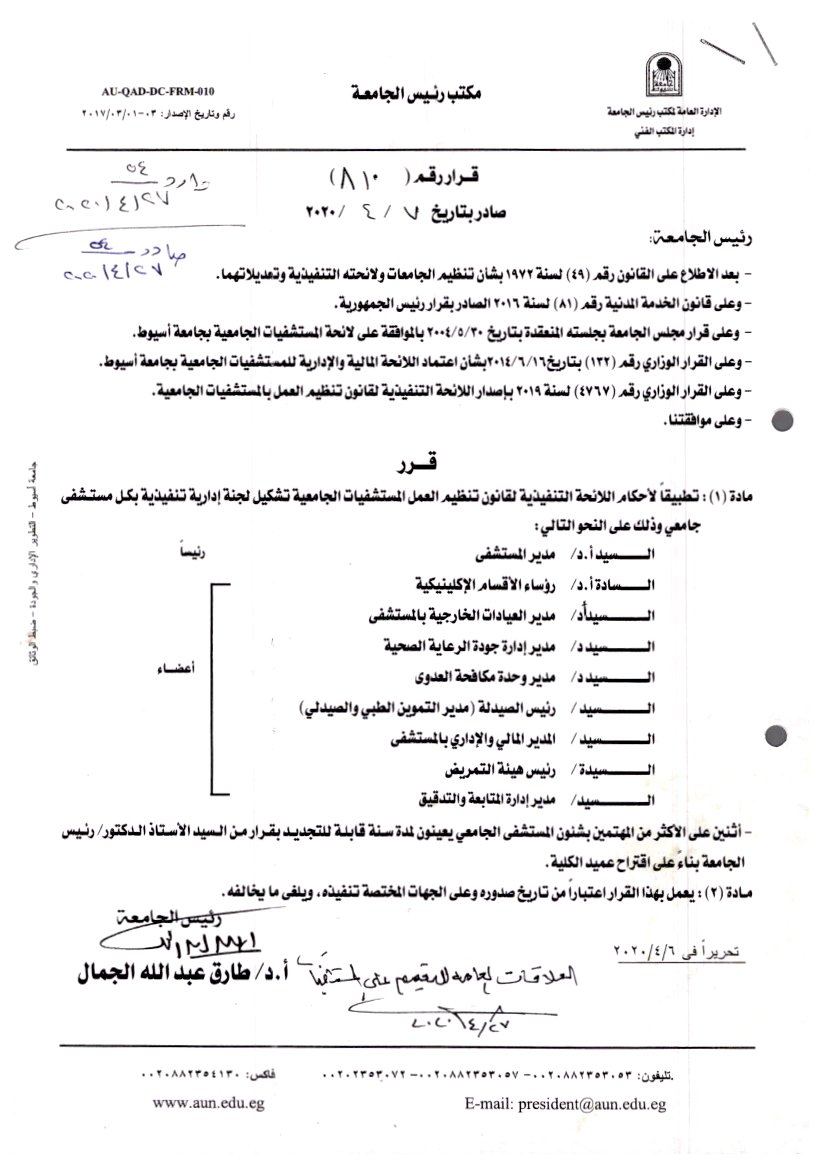 اعلان هام ............. قرار رئيس الجامعة عن تنظيم العمل بالمستشفيات الجامعية وتشكيل لجنة إدارية تنفيذية تعيين وقابلة للتجديد