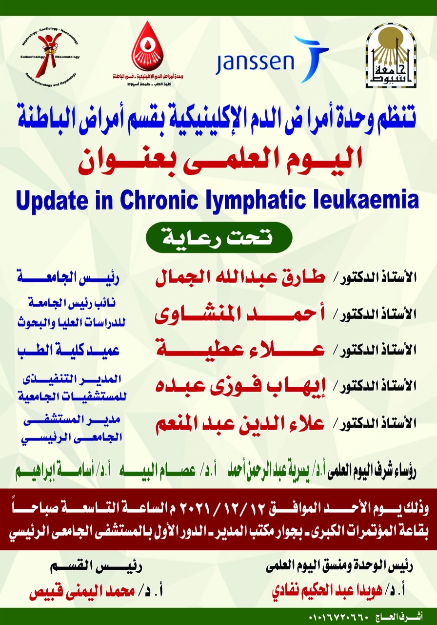 استمرارا للدور العلمي والتعليمي لمستشفيات جامعة أسيوط ، نظمت وحدة أمراض الدم الاكلينيكية بقسم أمراض الباطنة تحت رعاية الأستاذ الدكتور طارق الجمال رئيس الجامعة، والأستاذ الدكتور علاء عطية عميد كلية الطب ورئيس مجلس إدارة المستشفيات الجامعية،والأستاذ الدكتور يوسف صالح حسن وكيل كلية الطب للدراسات العليا والبحوث والأستاذ الدكتور إيهاب فوزي المدير التنفيذي للمستشفيات الجامعية ، والأستاذ الدكتور علاء عبدالمنعم مدير مستشفى الجامعي الرئيسي ، والأستاذ الدكتور محمد اليمني قبيص رئيس قسم أمراض الباطنة ، وبإشراف الأستاذ الدكتور هويدا عبد الحكيم نفادي رئيس وحدة أمراض الدم الاكلنيكية ومنسق اليوم العلمي,  والأستاذ الدكتور يسرية عبد الرحمن أستاذ أمراض الباطنة، يوما علميا تناول ليوكيما الدم الليمفاوية، حيث تم الاشارة إلى المستحدث في طرق العلاج والتشخيص لفئة كبار السن.