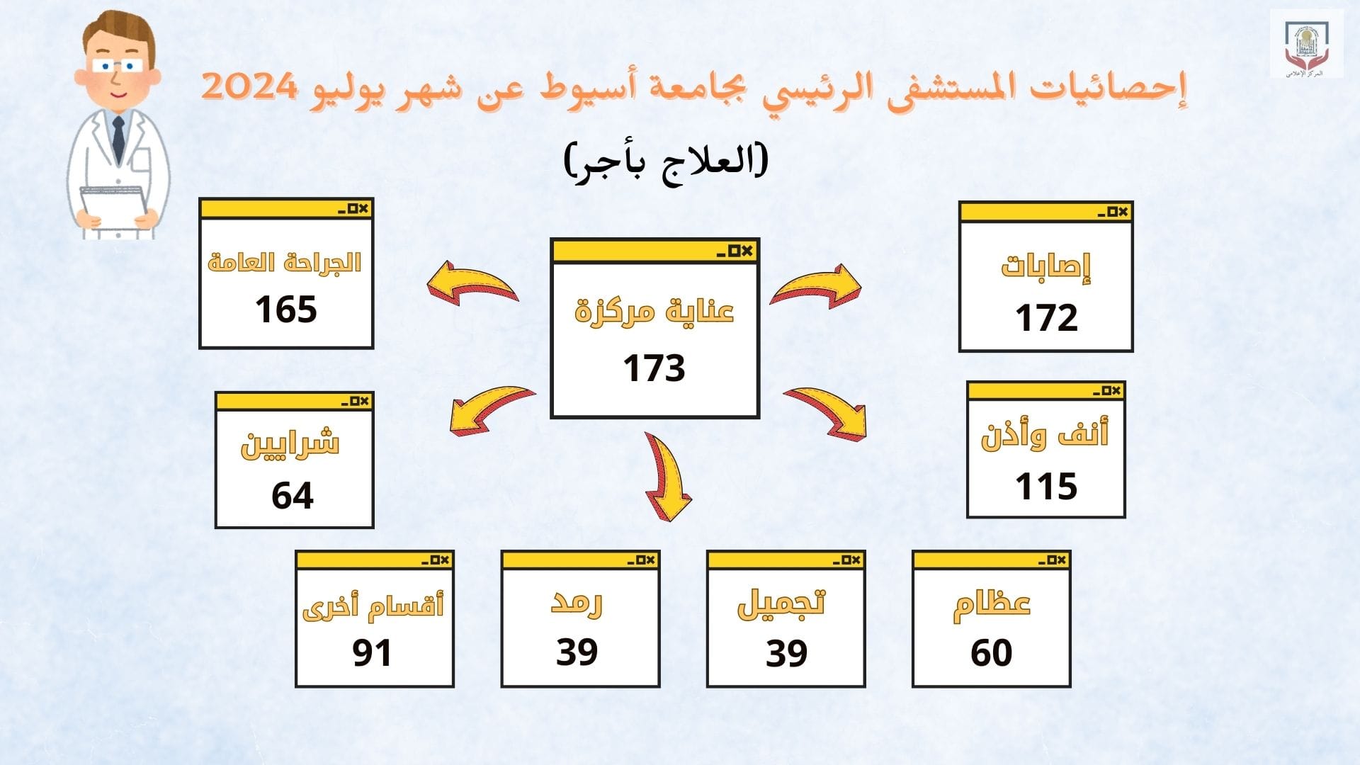 The main hospital at Assiut University announced the registration of (918) cases of admission to the various departments "paid treatment" during the month of July, under the auspices of Dr. Ahmed El-Minshawy, President of Assiut University, Dr. Alaa Attia, Dean of the Faculty of Medicine and Chairman of the Board of Directors of Hospitals, and Dr. Khaled Abdel Aziz, Director of the Hospital.
