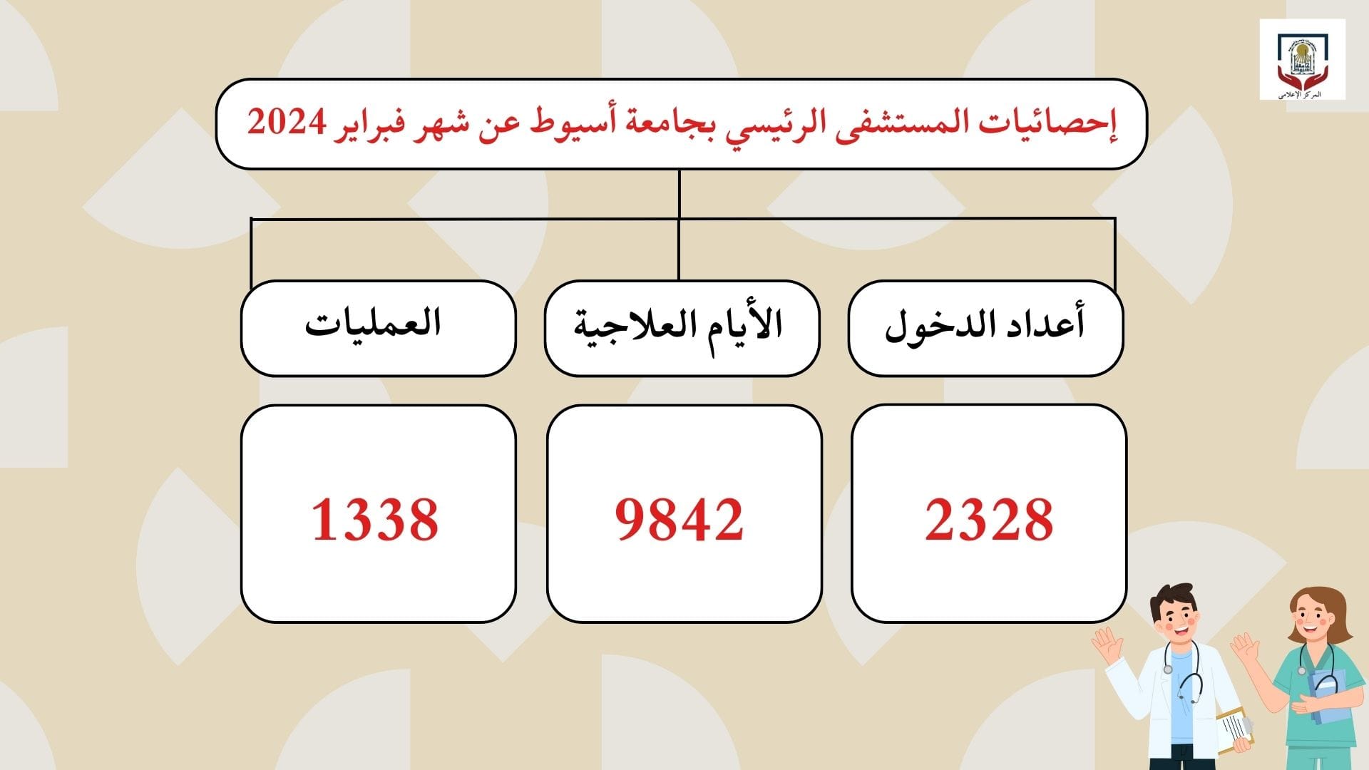 Assiut University Main Hospital has recorded (9842) cases in treatment days during the last month of February, under the supervision of Dr. Ahmed El-Minshawy, President of the University, Dr. Alaa Atia, Dean of the Faculty of Medicine and Chairman of the Board of Directors of University Hospitals, Dr. Ehab Fawzy, Executive Director of University Hospitals, and Dr. Khaled Abdel Aziz, Director of the Main Hospital.