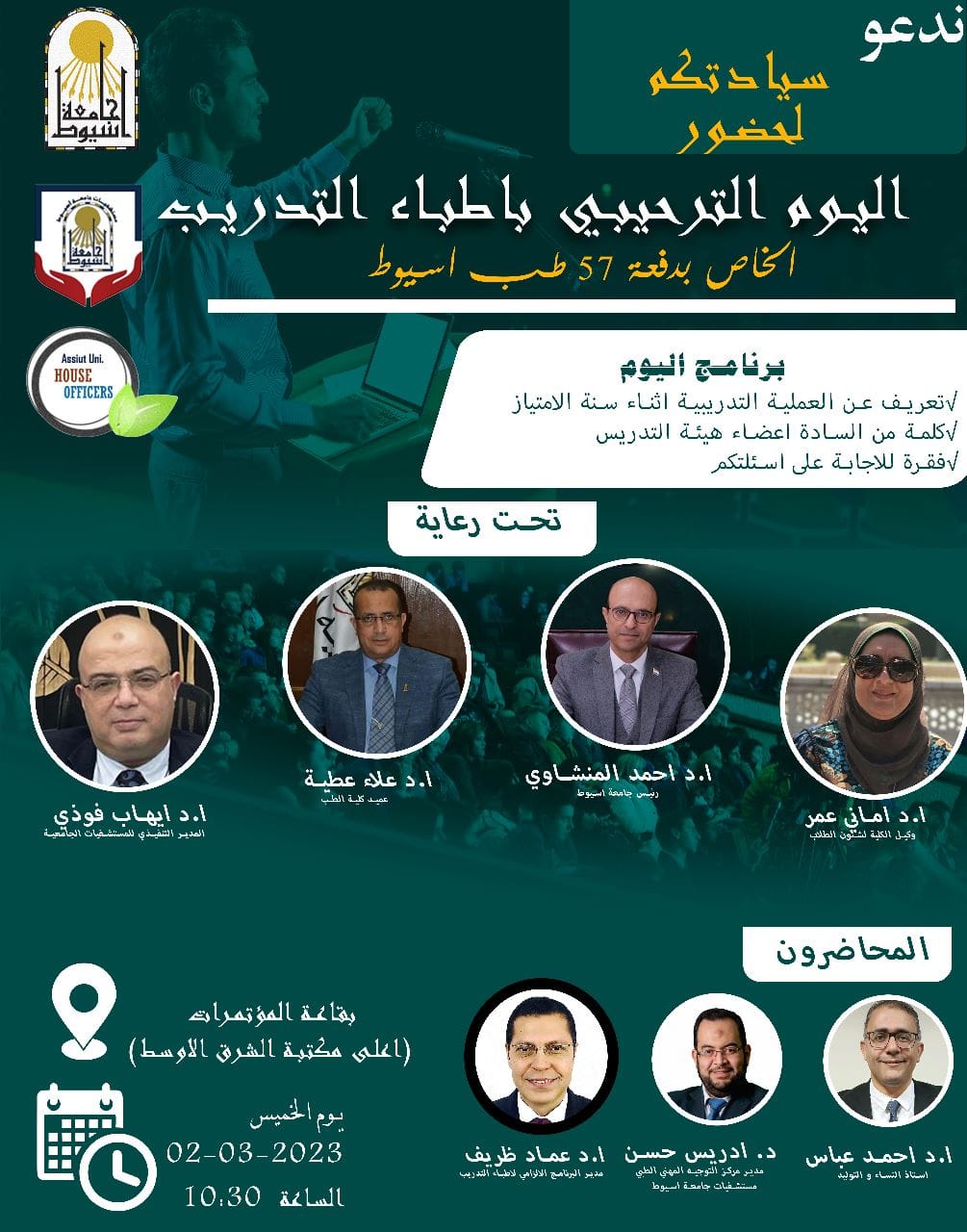 تنظم مستشفيات جامعة أسيوط اليوم الترحيبي بأطباء التدريب الخاص بدفعة ٥٧ طب أسيوط، غدا الخميس ٢ مارس٢٠٢٣م، تحت رعاية الأستاذ الدكتور أحمد المنشاوي رئيس الجامعة، والأستاذ الدكتور علاء عطيه عميد كلية الطب ورئيس مجلس إدارة المستشفيات الجامعية، والأستاذة الدكتورة أماني عمر وكيل الكلية لشئون التعليم والطلاب، والأستاذ الدكتور إيهاب فوزي المدير التنفيذي للمستشفيات الجامعية.